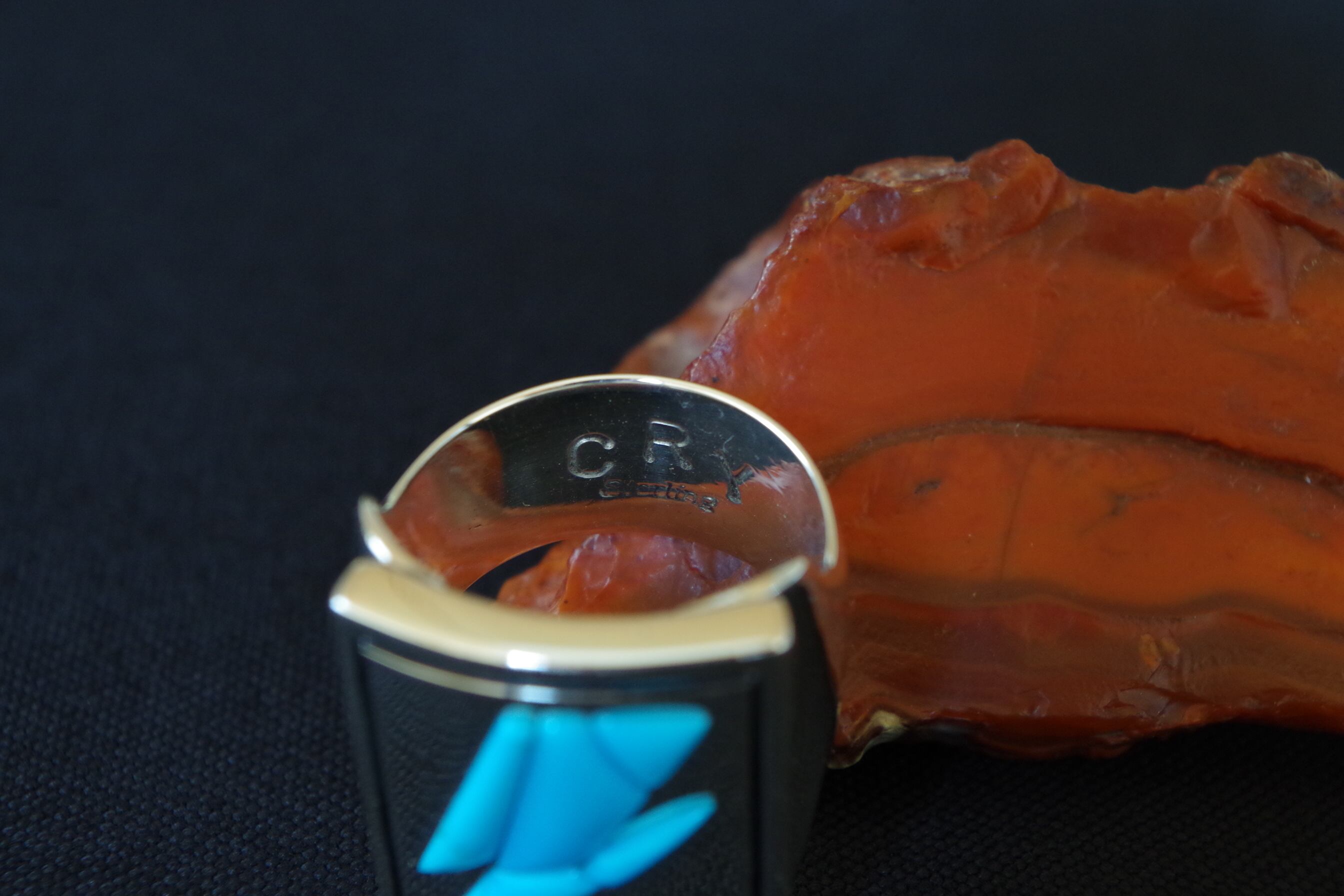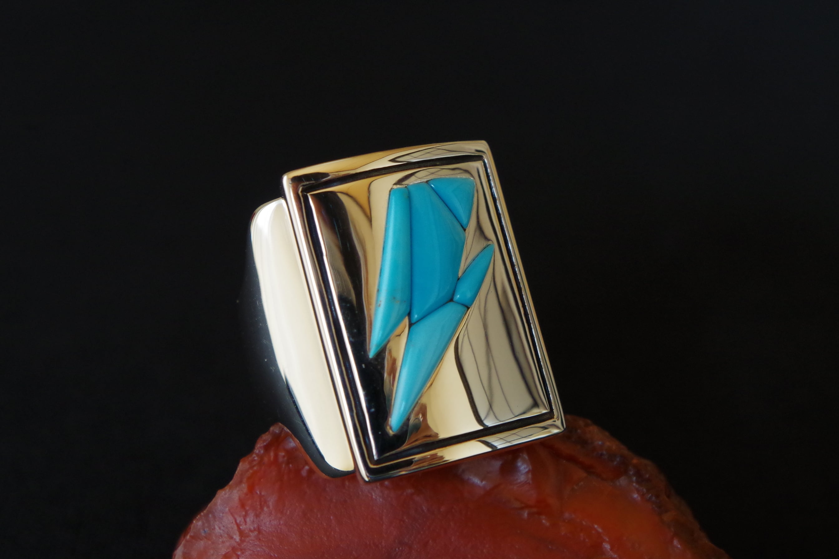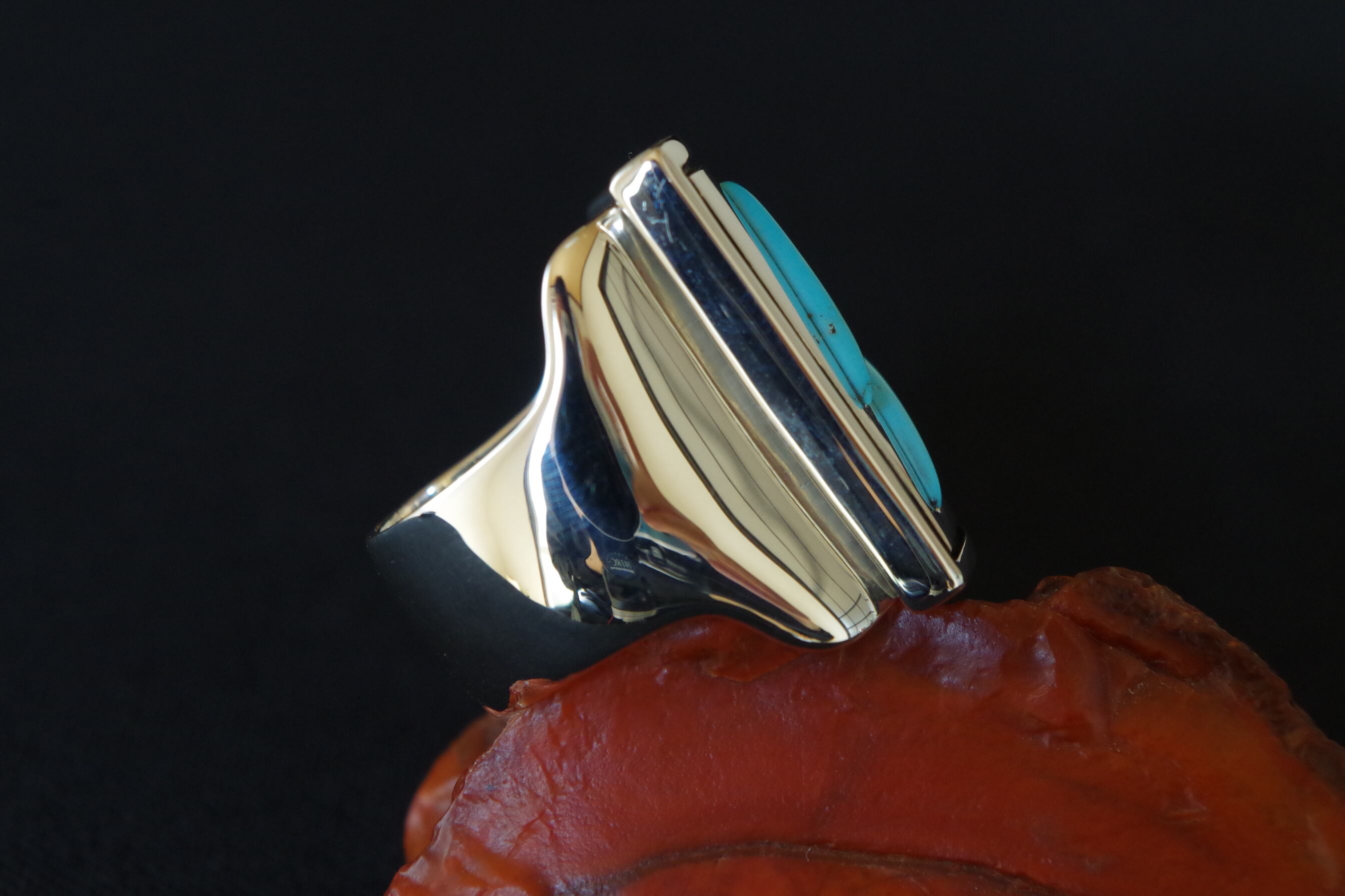ナバホ族 Chris Yazzie クリスヤジー作 ライトニングボルト スリーピングビューティーターコイズ シルバーインレイリング 20号 インディアンジュエリー