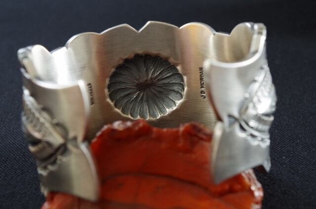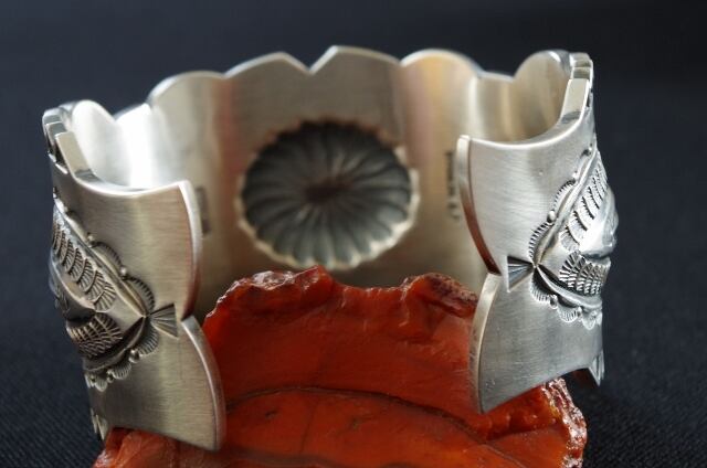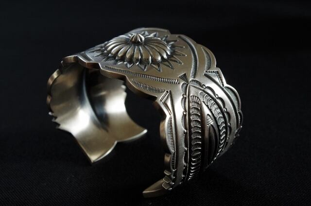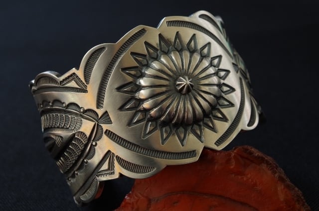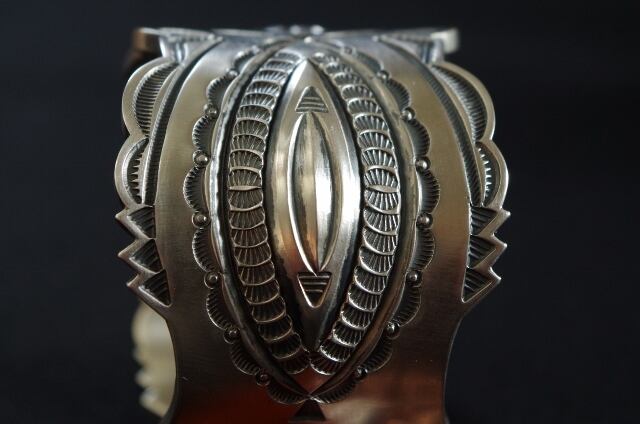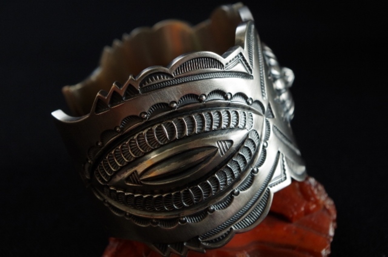 ナバホ族 Jacob Morgan ジェイコブモーガン作 リポウズ エンボス スタンプワーク シルバーバングル